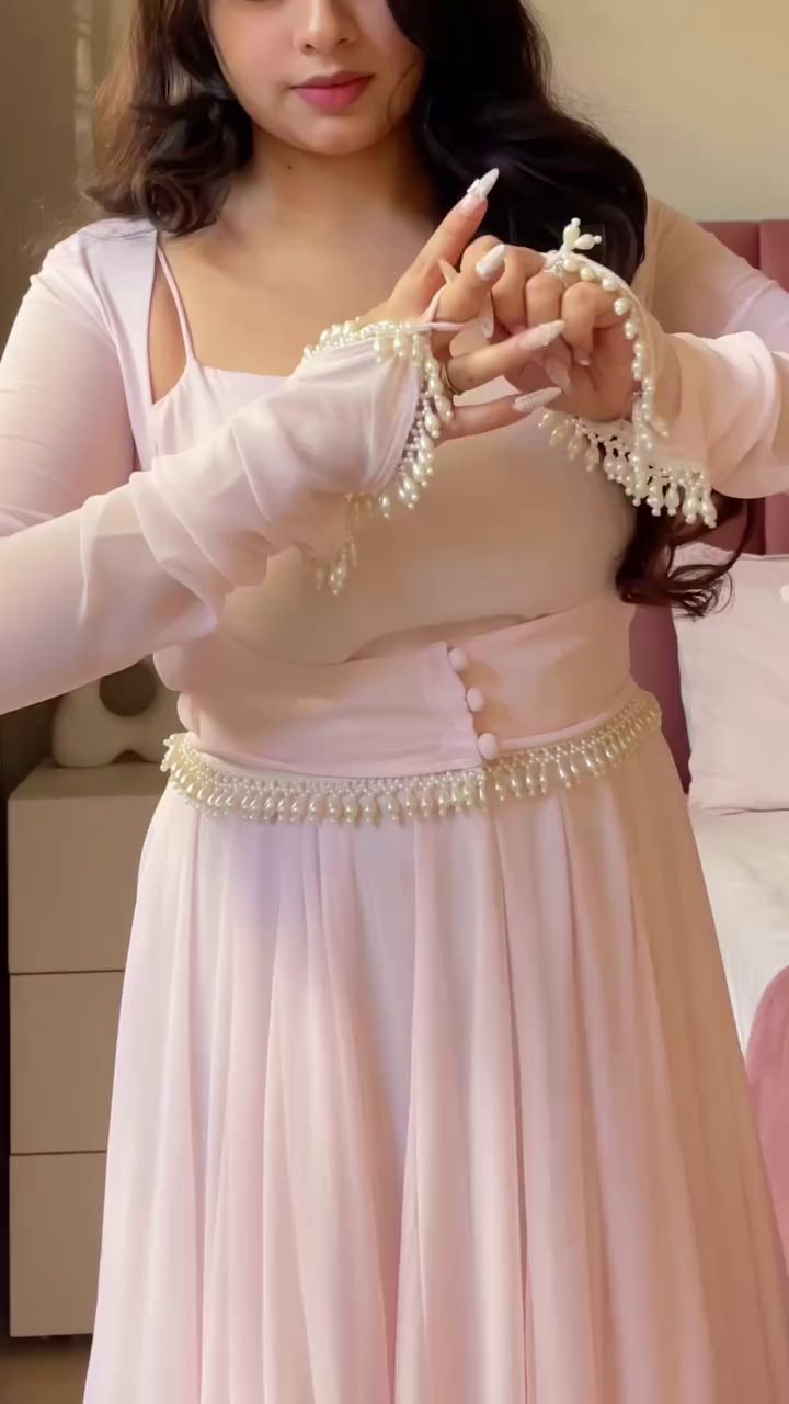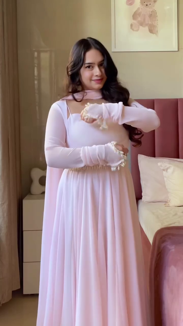 The dress features a flattering flared Anarkali pattern that creates stunning movement with every step. Its elegant neckline and finely tailored fit highlight the waistline while offering a regal appearance inspired by traditional Indian fashion. The airy georgette fabric drapes effortlessly, giving the outfit a dreamy and elegant look suitable for both day and evening events.