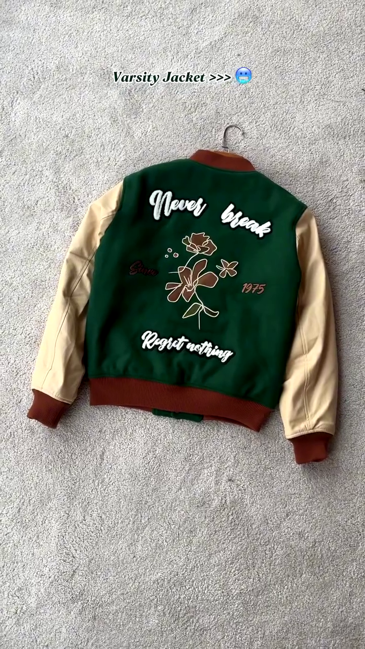 This jacket is a modern take on the iconic letterman style. The main body is crafted from a durable dark green fabric, complemented by light, contrasting sleeves. The jacket features: