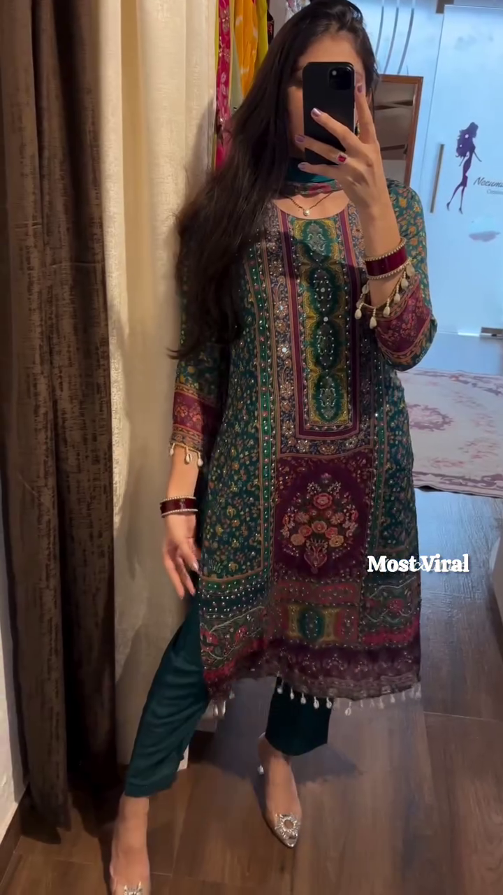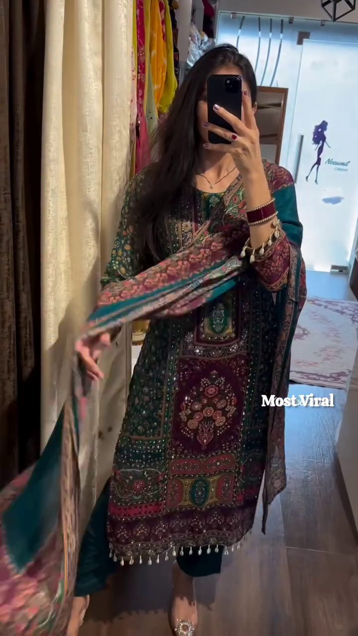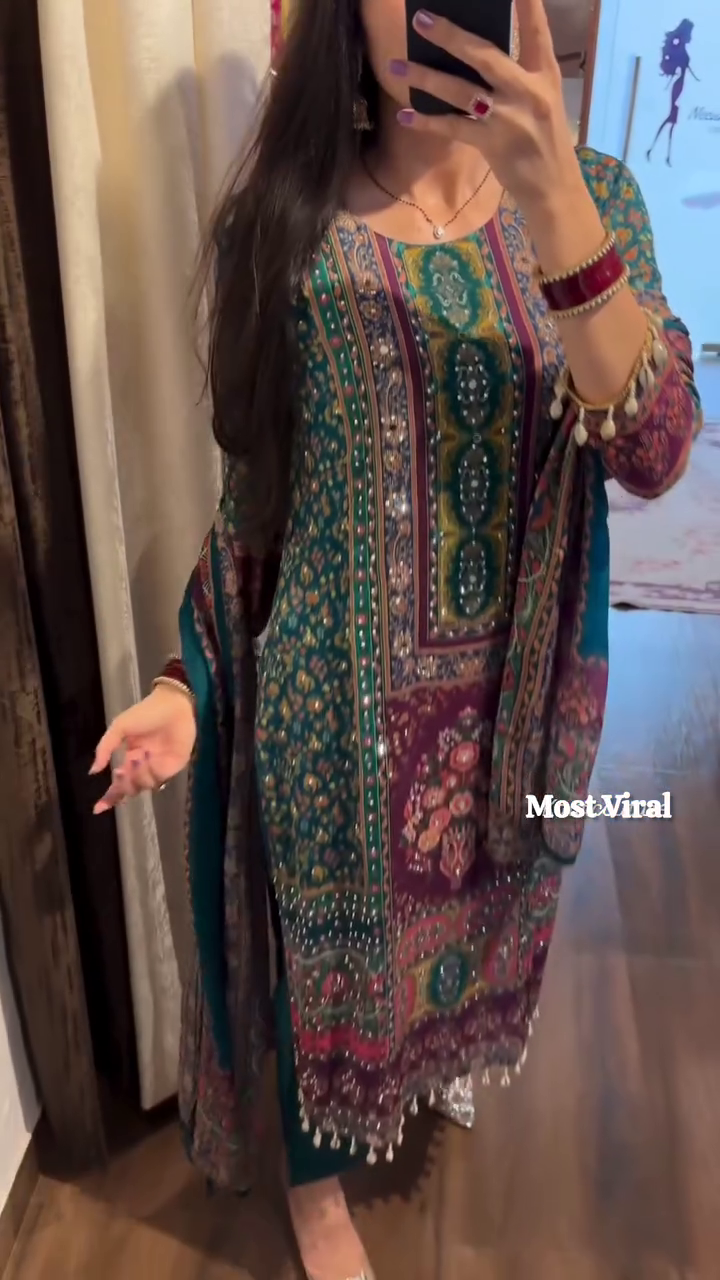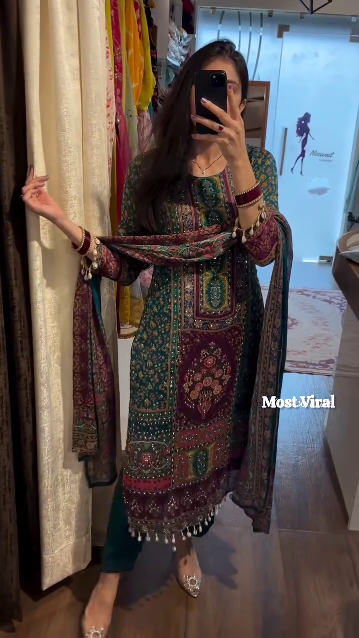 Paired with a matching dupatta adorned with elegant detailing, this ensemble completes a graceful ethnic statement. The flowy silhouette enhances movement, giving a flattering and feminine finish ideal for party styling. Style it with statement jewelry and heels to achieve a complete festive-ready look.